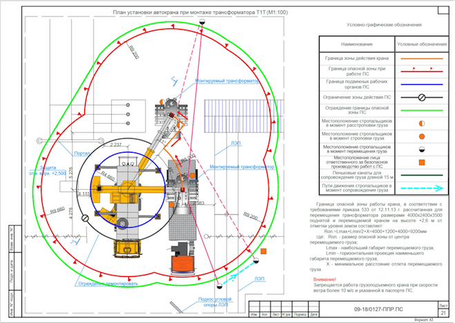 Проект производства работ ППРк (ППР.пс) с применением подъемных сооружений, выполнен на работы по демонтажу старого (не пригодного для дальнейшей эксплуатации) и монтажу нового трансформаторов.